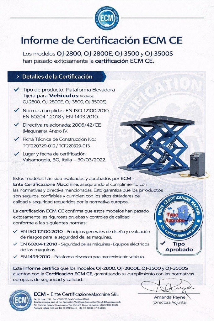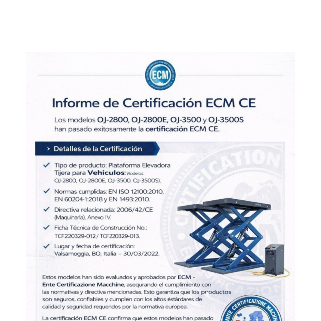 Ente Certificazione Macchine (ECM) has become aware of the circulation of a document titled Informe de Certificacion ECM CE concerning a “Plataforma Elevadora tijera para vehiculos”.